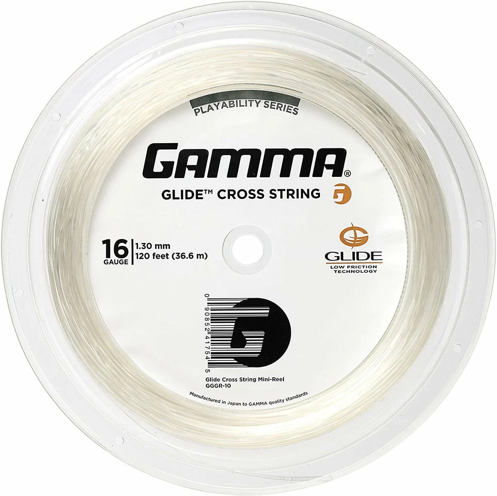 Gamma Glide is a revolutionary string that dramatically reduces the sliding friction between strings to create more spin, power and comfort. Gamma Glide is intended to be used as a cross string for any main (vertical) string for better string movement.